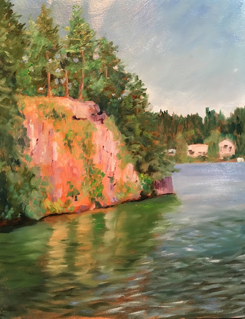 Monet painted his haystacks over and over again, and I keep going back down to the boathouse to paint Phantom Bluff because I want more practice at painting from life, but I seem to end up with nearly the same painting each time.  I think it must be a lack of vision on my part, because I see the same thing, or maybe it is that I am painting what I believe to be there rather than what I see, so my left brain keeps interfering....  I should probably change my palette and force myself to paint it in different colors, rather than trying for what I see objectively.  Maybe next time?